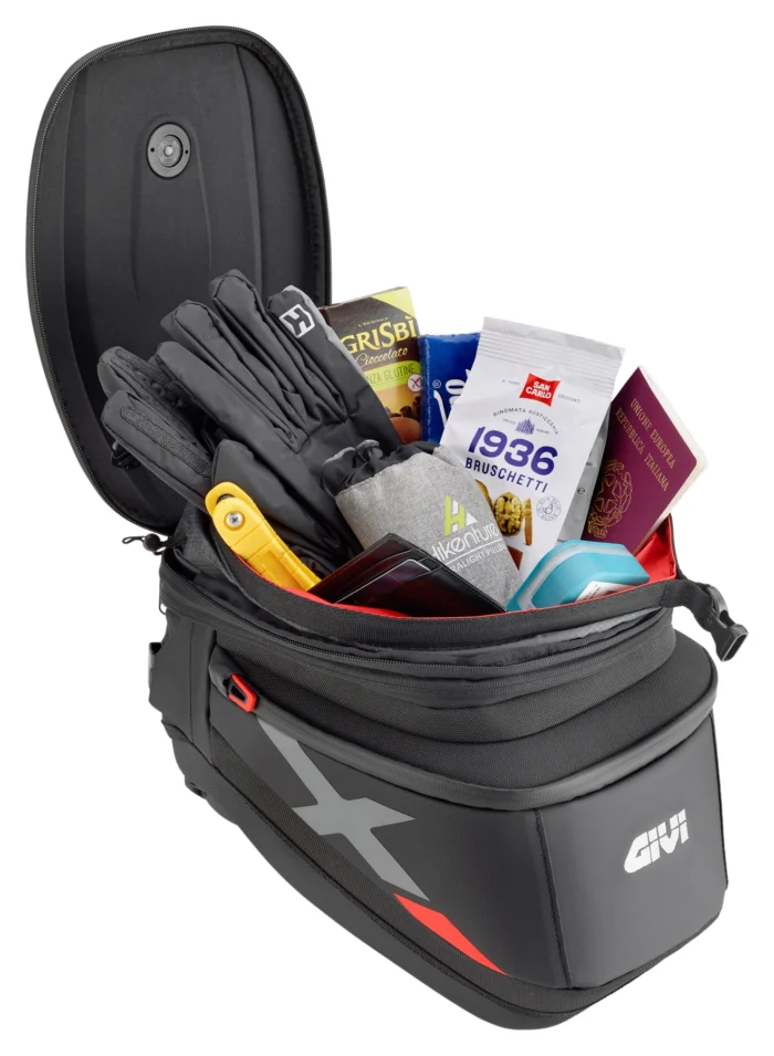Givi a mis au point une sacoche de réservoir spéciale pour certaines motos Honda et Kawasaki. Voici le Givi *X-Line XL05 Tanklock* avec un volume de 15 à 18 litres (grâce à l’extension du volume par fermeture zippée). En plus du grand compartiment principal, il y a une autre poche extérieure, une poche pour carte amovible et un sac intérieur imperméable amovible avec fermeture à enroulement. La *X-Line XL05 Tanklock* de Givi est une sacoche de réservoir polyvalente qui vous procurera beaucoup de plaisir.